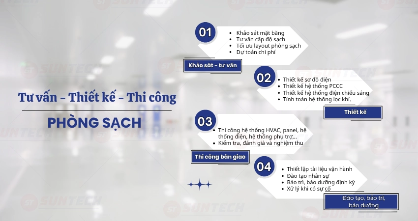 SUNTECH – Đơn vị cung cấp cung cấp dịch vụ thiết kế và thi công xây dựng phòng sạch dược phẩm trọn gói. Ngoài ra, chúng tôi còn cung cấp các dịch vụ tư vấn thiết kế phòng sạch thực phẩm, điện tử, mỹ phẩm,…Cam kết đem lại giải pháp hiệu quả và an toàn cho dự án của bạn.